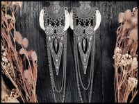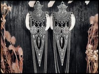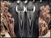 Uniquely handcrafted witch earrings with coyote tooth & chains. The charm has beautiful, filigree decorations. The earrings are a bit heavier according to the size. The chains ensure a nice ringing on the ear! You can also have the earrings upgraded with 925 sterling silver hooks!