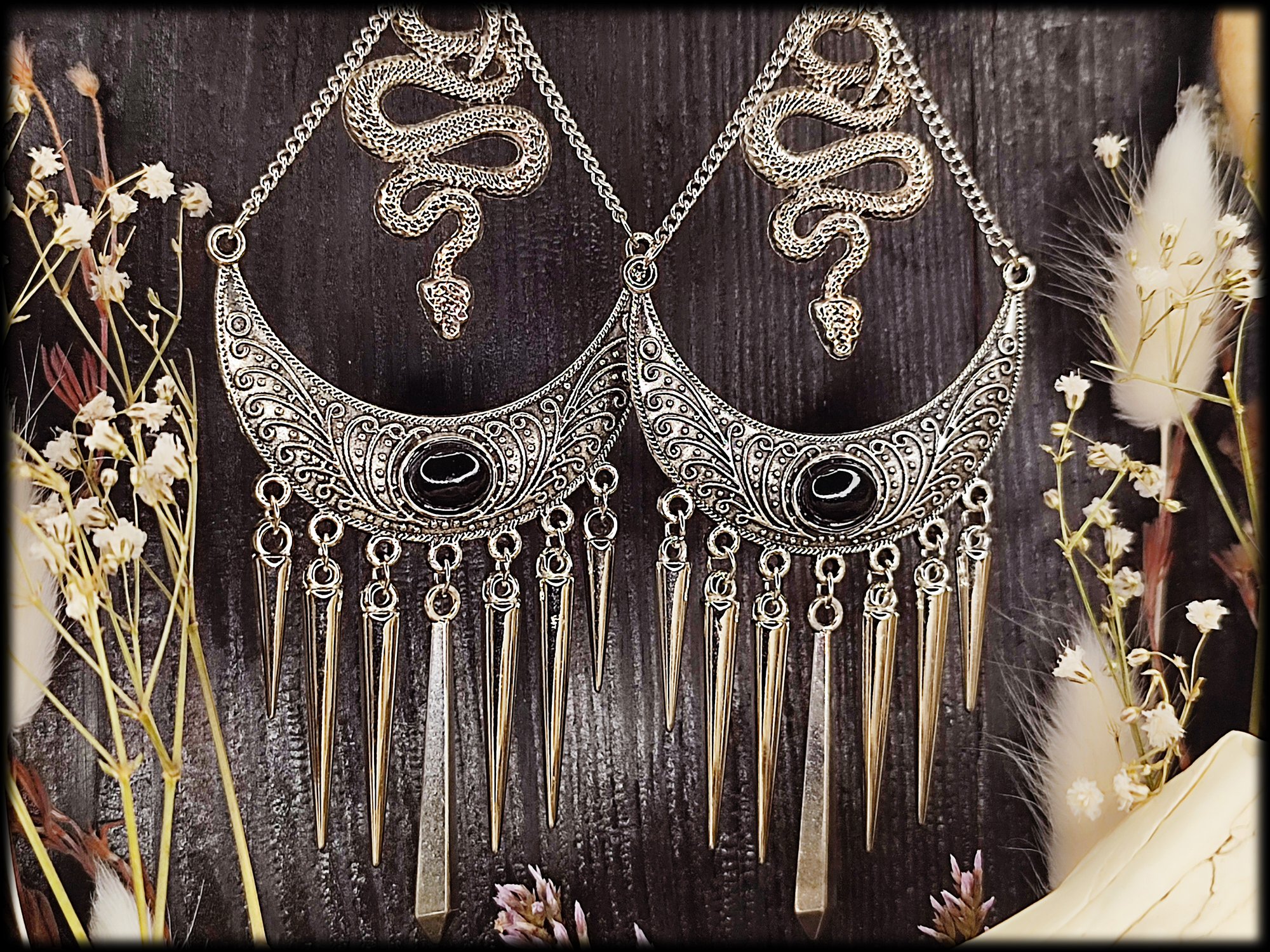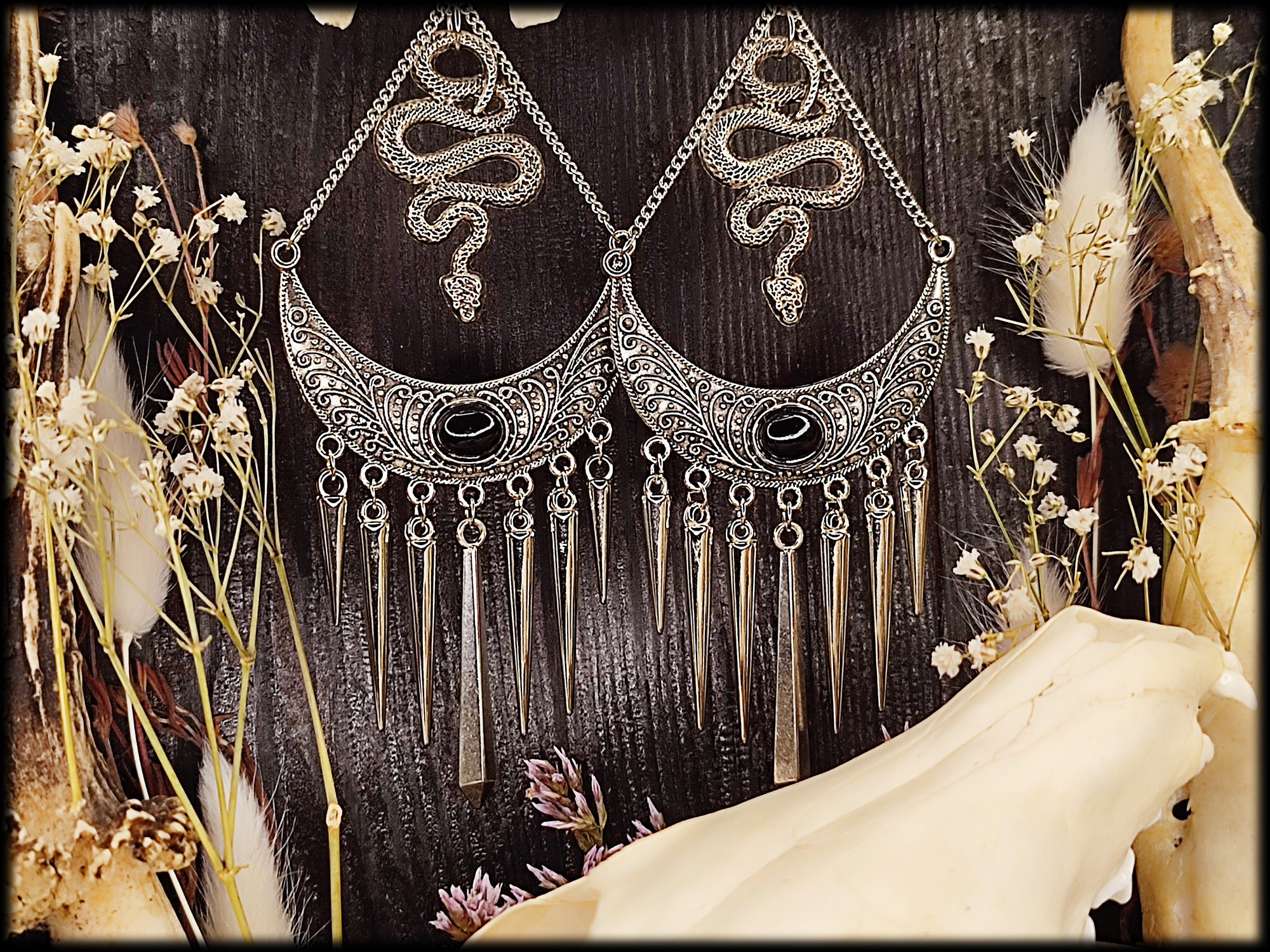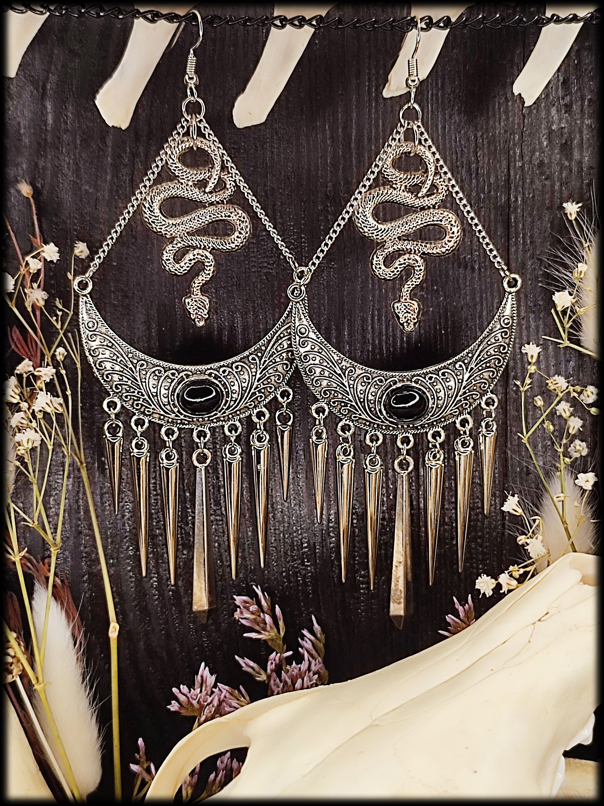 Uniquely handcrafted earrings with spikes & snakes. The charm has beautiful filigree decorations. The earrings are a bit heavier according to the size. The spikes ensure a nice ringing on the ear! You can also have the earrings upgraded with 925 sterling silver hooks!