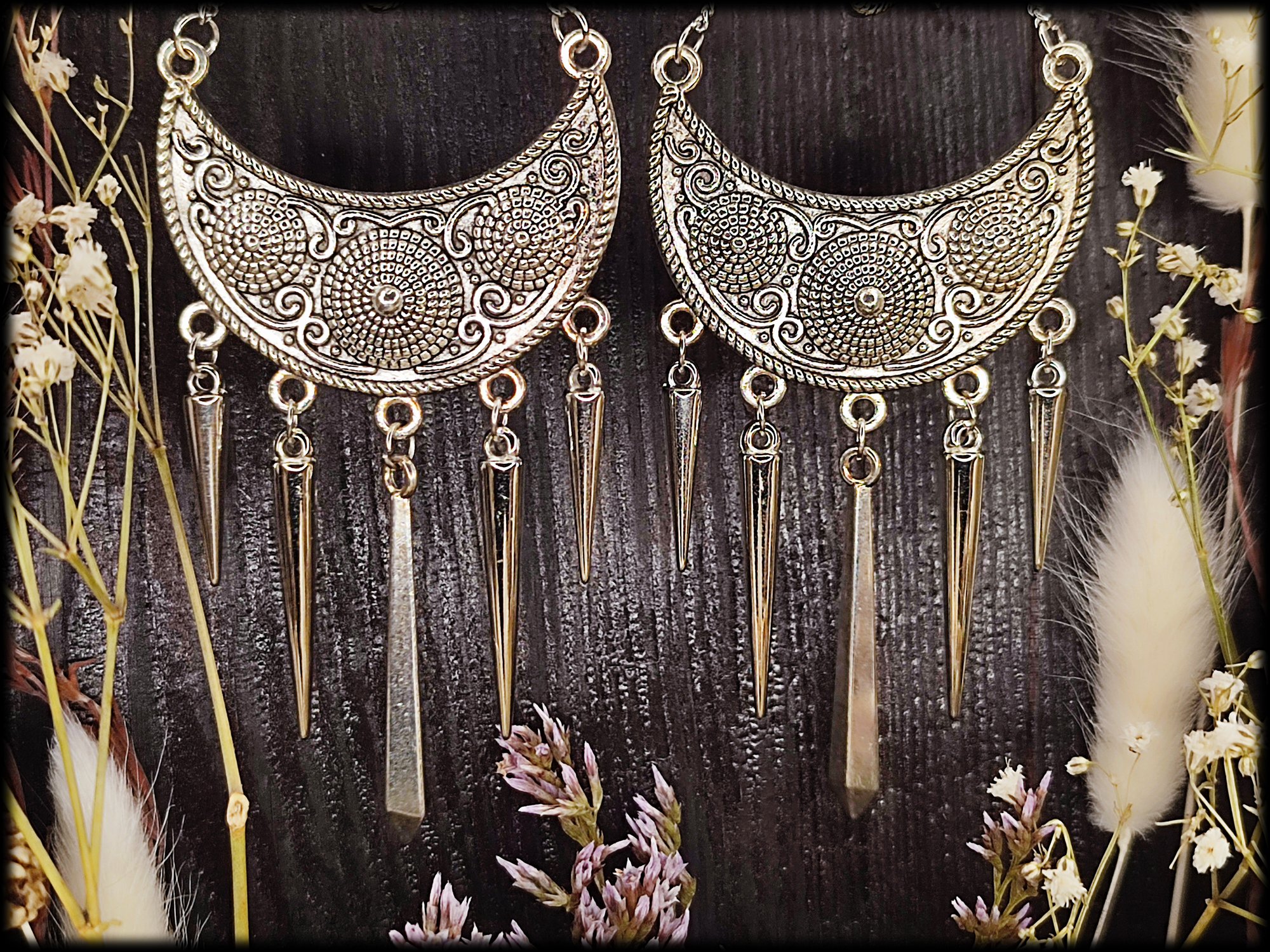 Uniquely handcrafted earrings with spikes & snakes. The charm has beautiful filigree decorations. The earrings are a bit heavier according to the size. The spikes ensure a nice ringing on the ear! You can also have the earrings upgraded with 925 sterling silver hooks!
