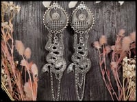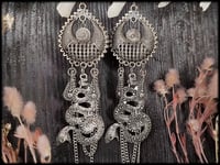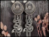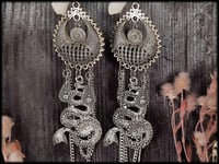 Uniquely handcrafted snake earrings with drops and chains. The charm has beautiful filigree decorations. The earrings are a bit heavier according to the size. The spikes & chains ensure a nice ringing on the ear! You can also have the earrings upgraded with 925 sterling silver hooks!